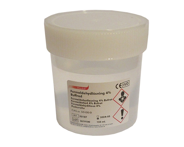 150 ml 4% Formaldehydløsning i 250 ml bøtte. Holdbarhed: Mindst 3 år. Holdbarheden gælder uåbnet emballage opbevaret ved stuetemperatur.